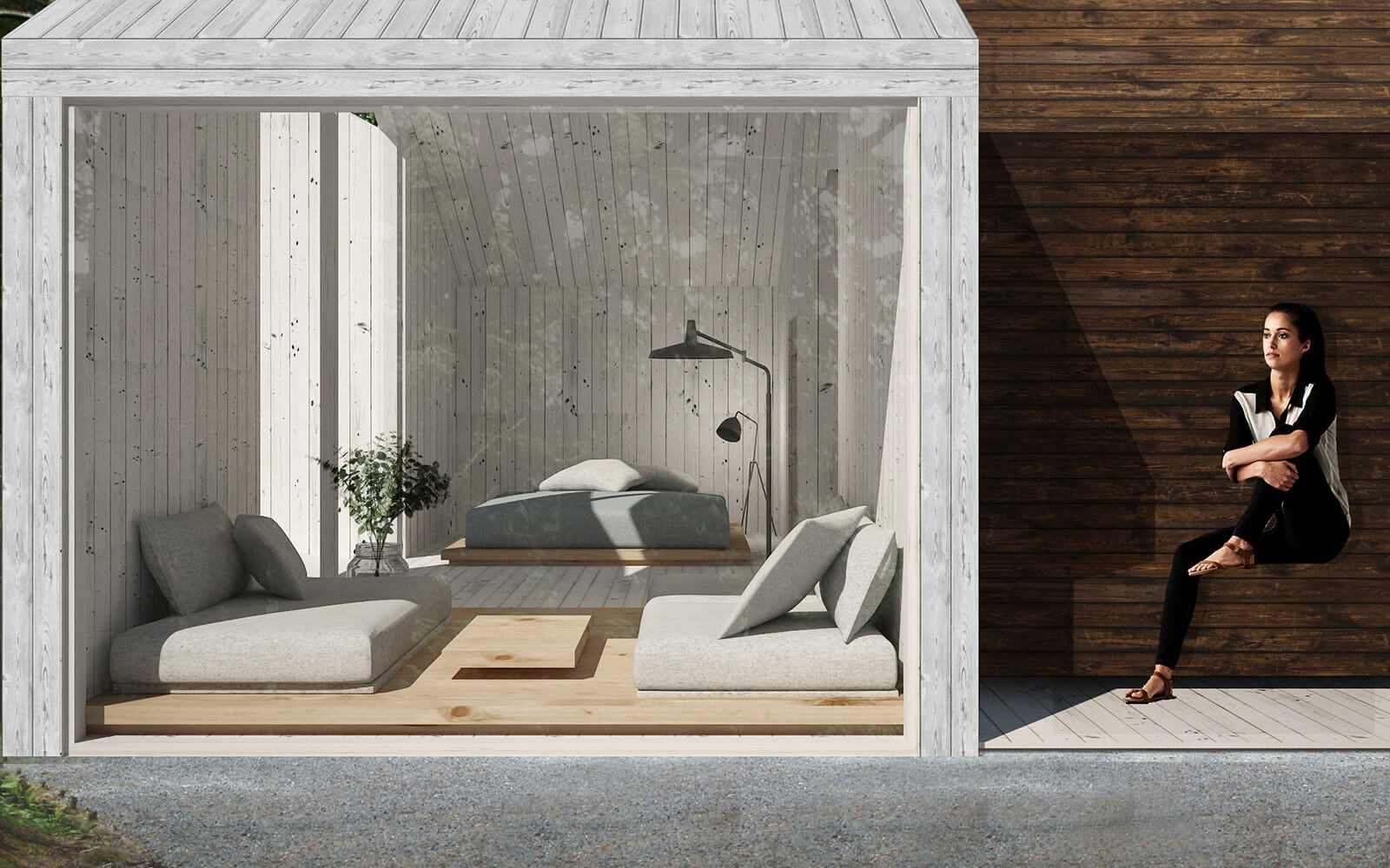 Minimalistyczna bry艂a, kt贸r膮 tworz膮 cztery, kontrastuj膮ce cz臋艣ci. Ka偶dej z nich odpowiada strefa we wn臋trzu. Dom jest otwarty, przejrzysty, zapewnia swobodne przemieszczanie si臋 i dowoln膮 aran偶acj臋 wn臋trza. Przeszklenia i nieregularno艣膰 elewacji wprowadzaj膮 dynamik臋 od zewn膮trz umo偶liwiaj膮c intymny kontakt z otoczeniem.
